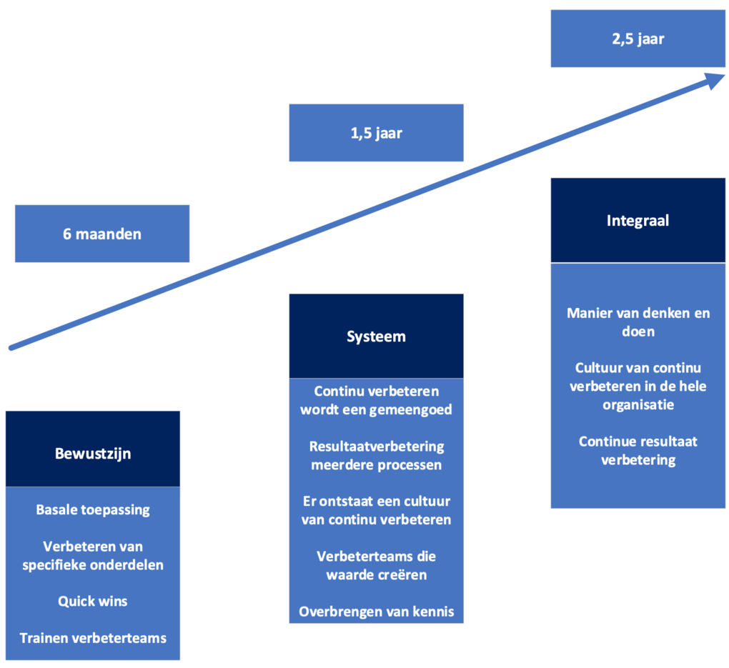 Een cultuur creëren waarin elke medewerker (dagelijks) kijkt of het werk anders en beter uitgevoerd kan worden is een meerjarige reis. Een reis die opgedeeld wordt in korte termijn doelen/acties en doelen voor de middel en lange termijn. Ieder individu of team doorloopt een eigen ontwikkelproces. De fase van ontwikkeling is mede bepalend voor het tempo waarin de gedrags- en cultuurverandering tot stand komt.
